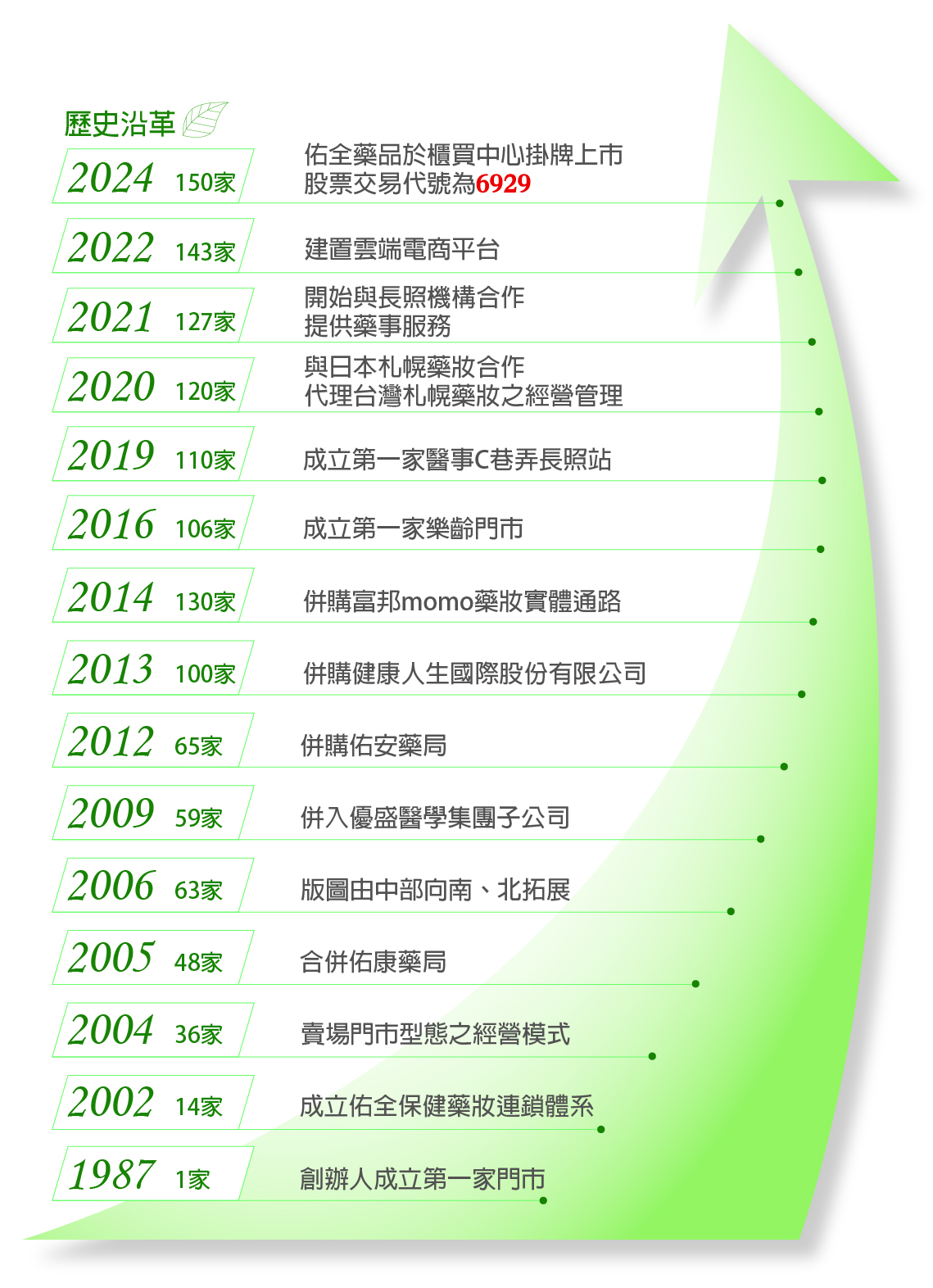 佑全藥品股份有限公司成立於1972年,旗下擁有三大連鎖藥局通路公司主要從事醫療保健產品的批發、進口和銷售,產品包括西藥、中藥、保健食品和美容保養品等,服務對象包括藥局、診所、醫院和大型連鎖店等。佑全藥品全省落地生根,啟動社區健康服務中心的希望工程,以「您健康的顧問」之企業精神,致力提供顧客最優質的購物環境、最專業的藥事服務、最豐富的產品選擇,同時深入社區舉辦各類健康檢測、親子競賽等活動,啟動社區健康服務中心的希望工程誠摯地邀請各位加入我們的行列~